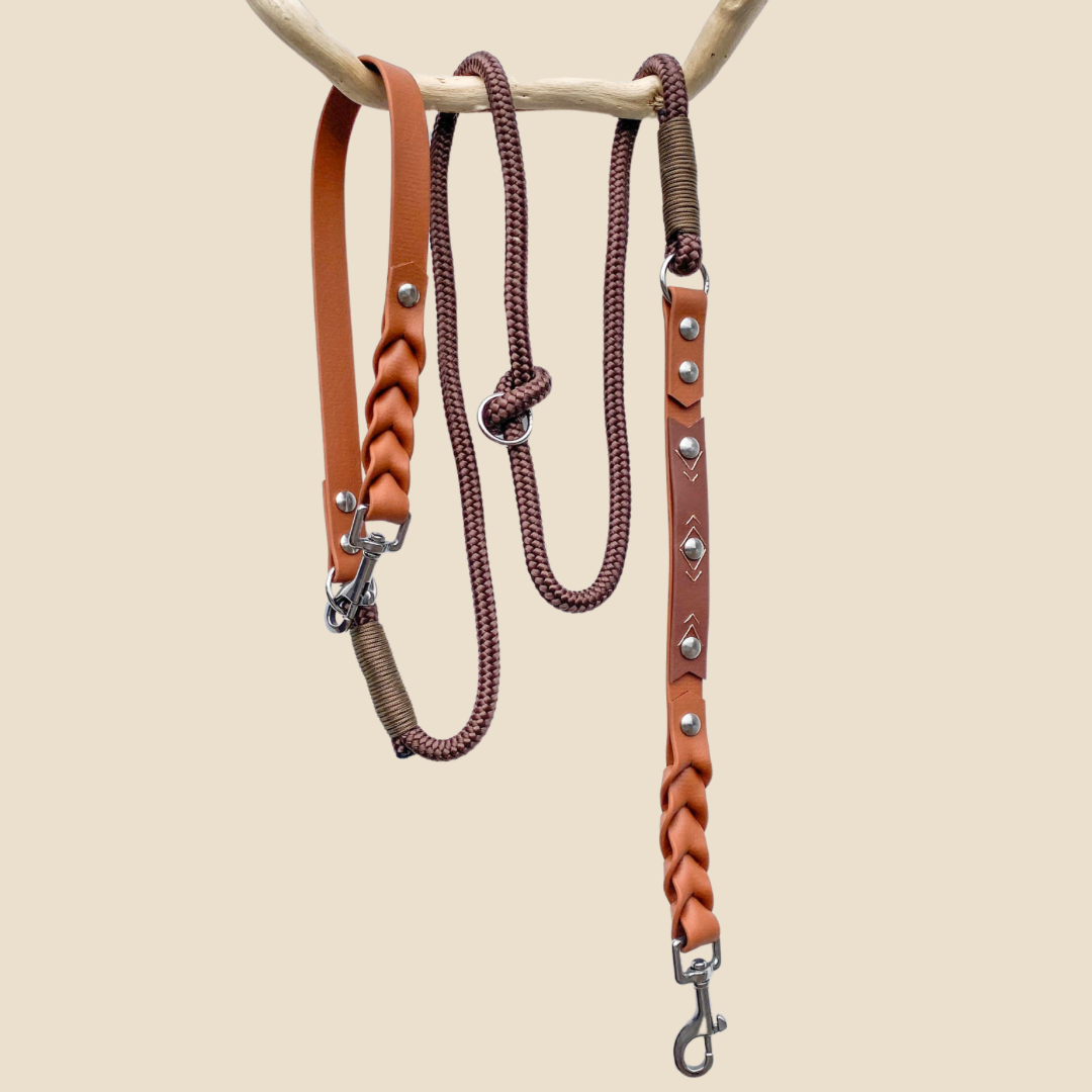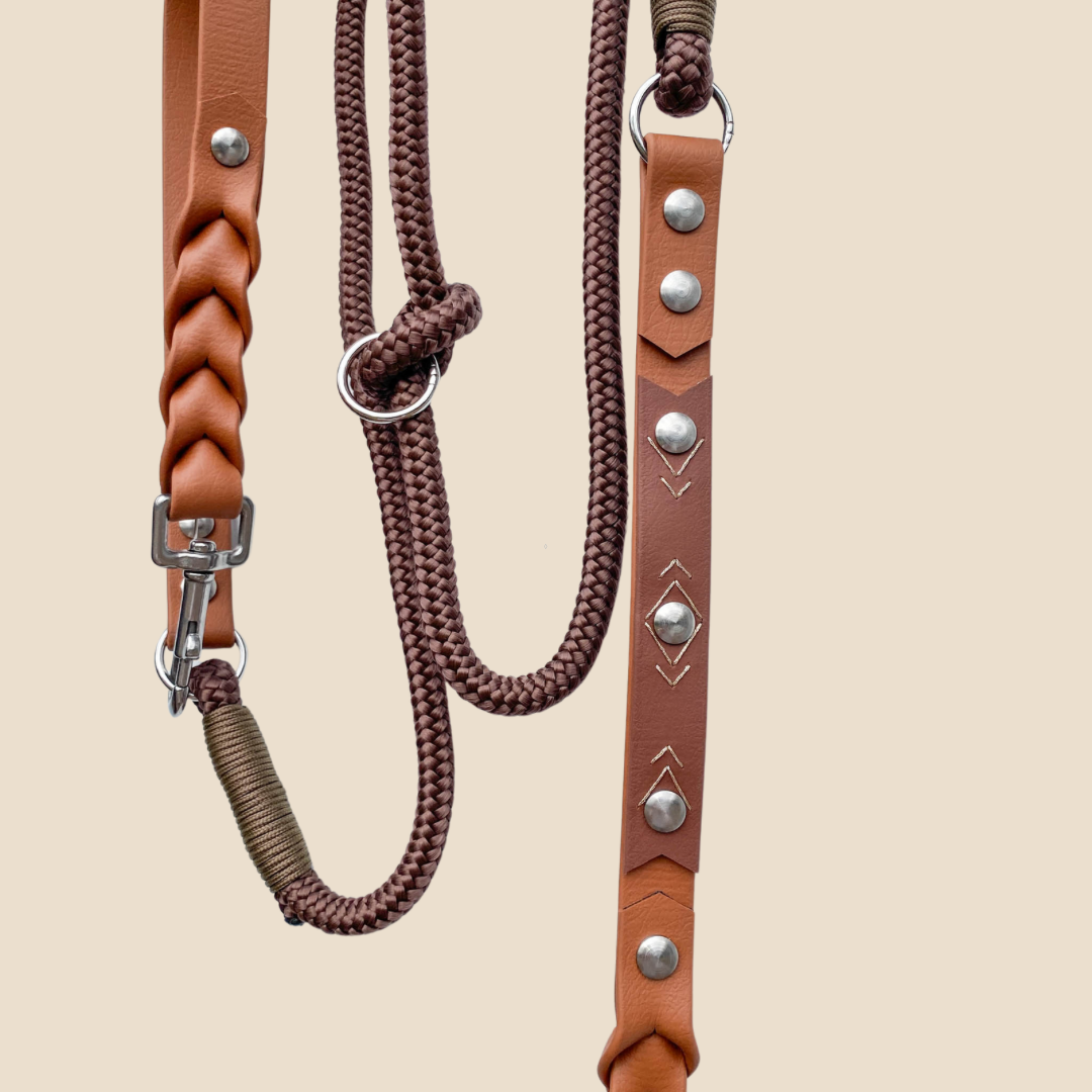 Cette laisse accompagne les pas, les pauses, les escapades. Faite à la main, elle mêle style, légèreté et solidité pour suivre tous vos chemins — avec grâce et assurance. L’essentiel, c’est d’avoir le choix : trois points d’attache pour s’adapter à chaque situation.