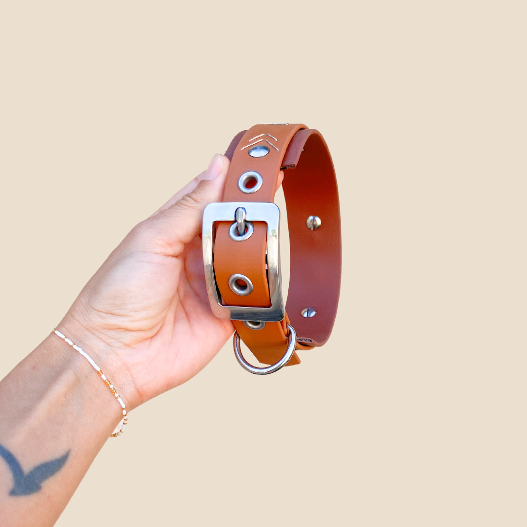 Nos colliers sont conçus avec 4 trous, le deuxième étant parfaitement ajusté au tour de cou de votre chien.Cela vous laisse une marge d'ajustement avant et après pour plus de flexibilité. Ajouter plus de trous allongerait la languette, risquant de cacher le design du collier.