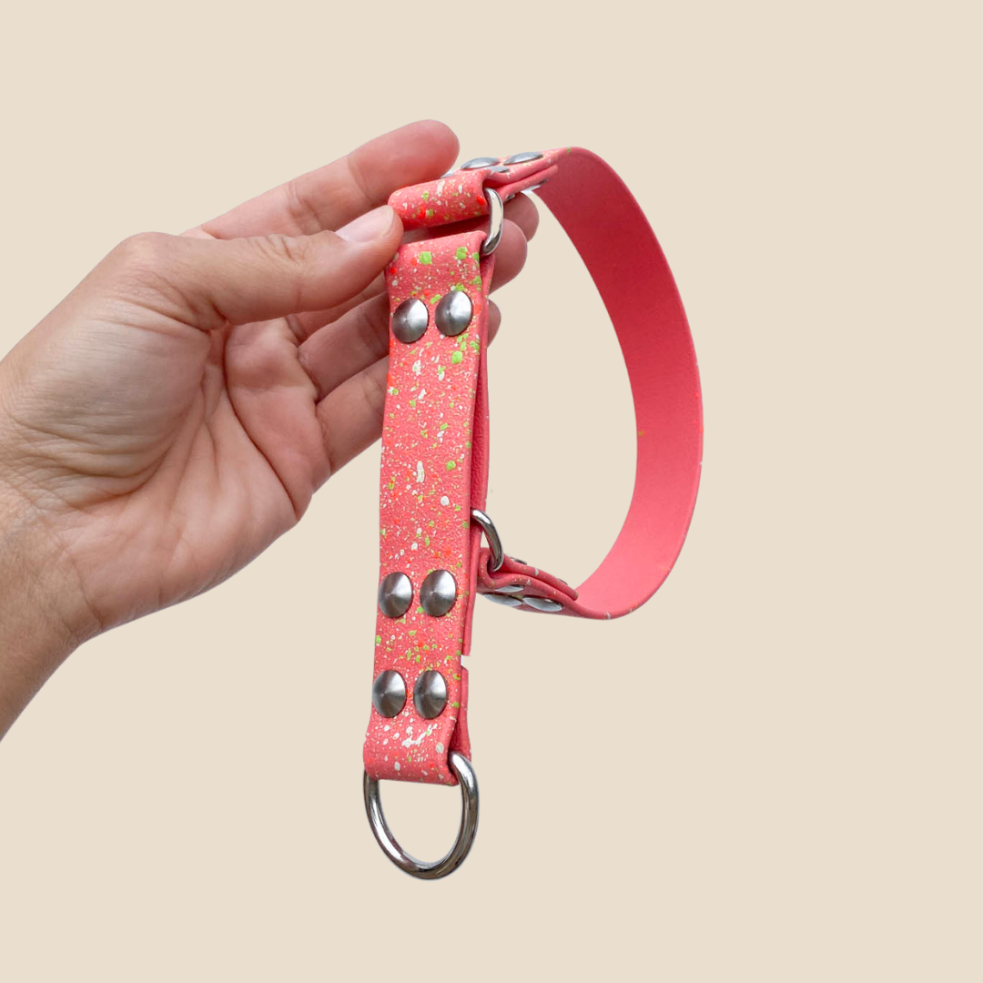 On a trouvé le combo parfait pour toi et ton chien : du Biothane (le vrai, de la marque officielle) et de l’acier inoxydable. Résultat ? Nos créations sont ultra-résistantes. Pas besoin de frotter les boucles ni d’éviter l’eau. Laisse ton chien vivre sa meilleure vie !